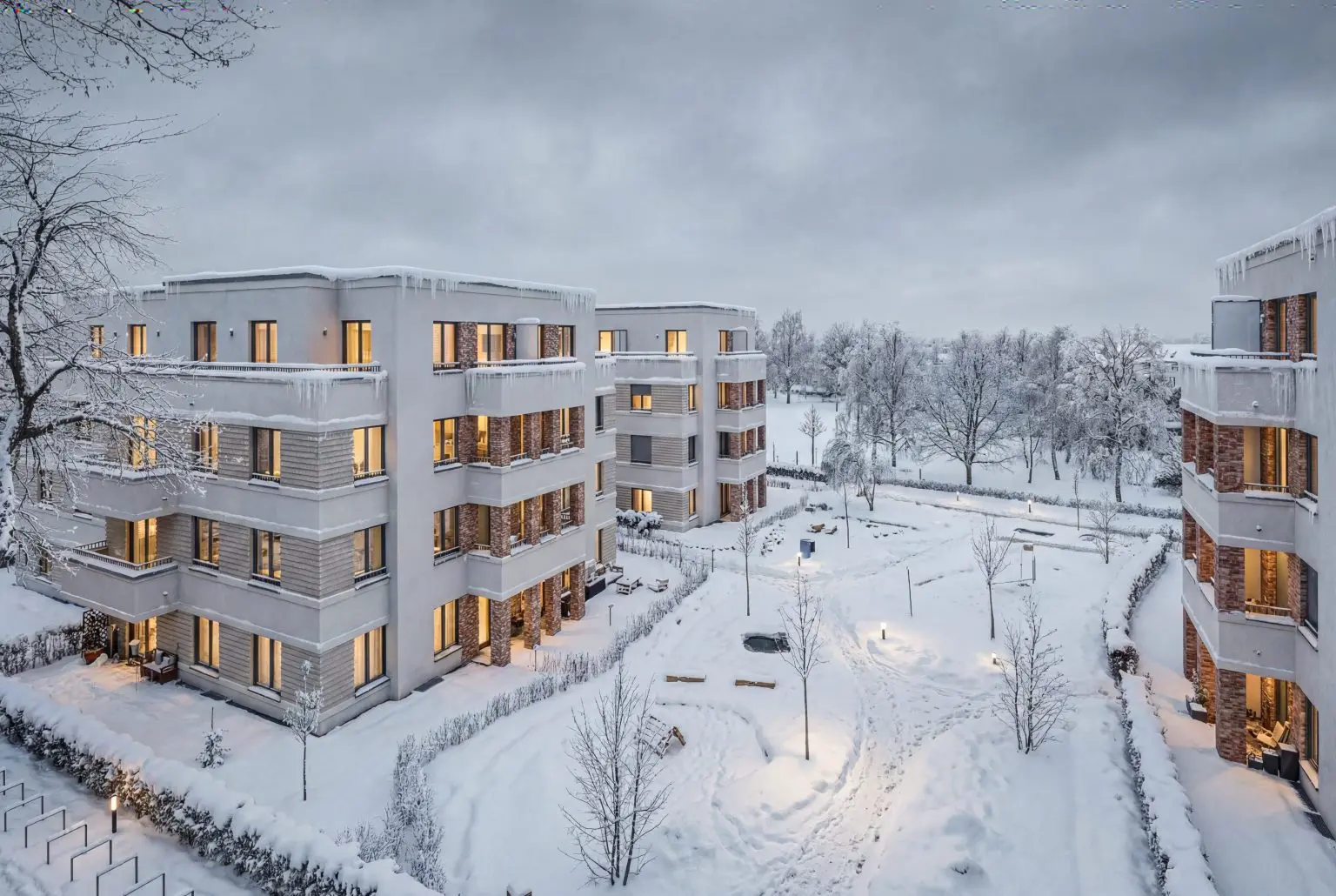 Alle Wohnungen im Erdgeschoss verfügen über einen eigenen Garten — die Wohnungen in den oberen Geschossen bieten Balkone oder Loggien mit reizvoller Aussicht.