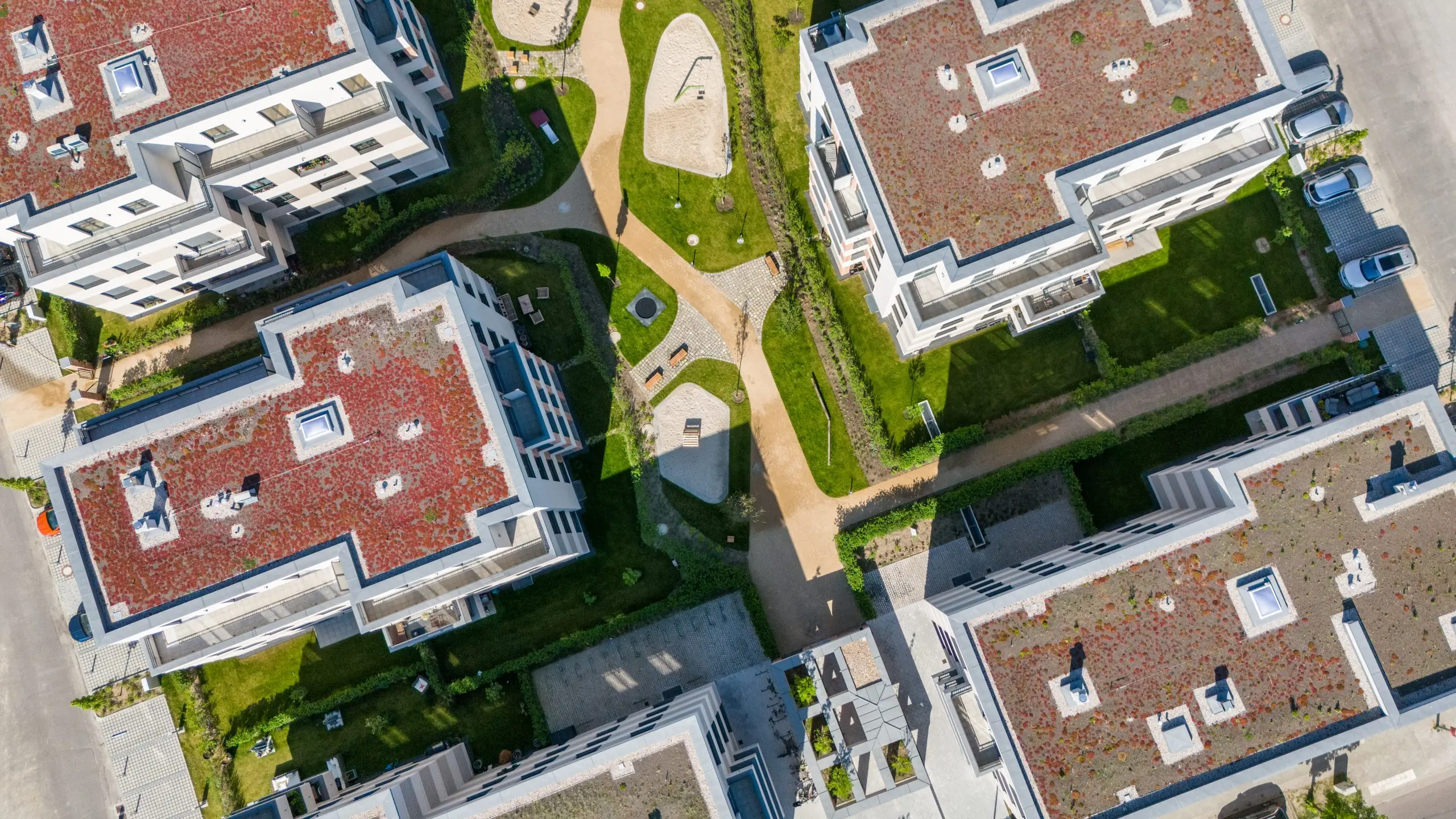 Die Architektur verbindet villa-artige Wohnqualität mit durchdachter Planung: Die Häuser umschließen einen privaten Innenhof mit Garten, der Raum für Gemeinschaft und Freizeit bietet.